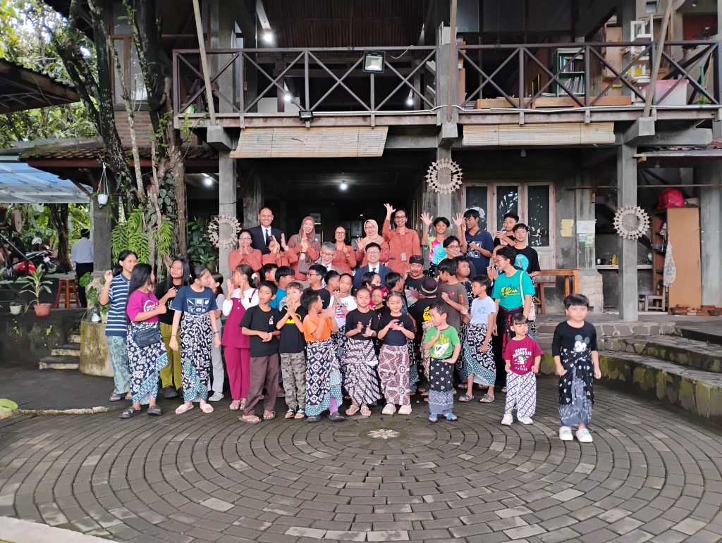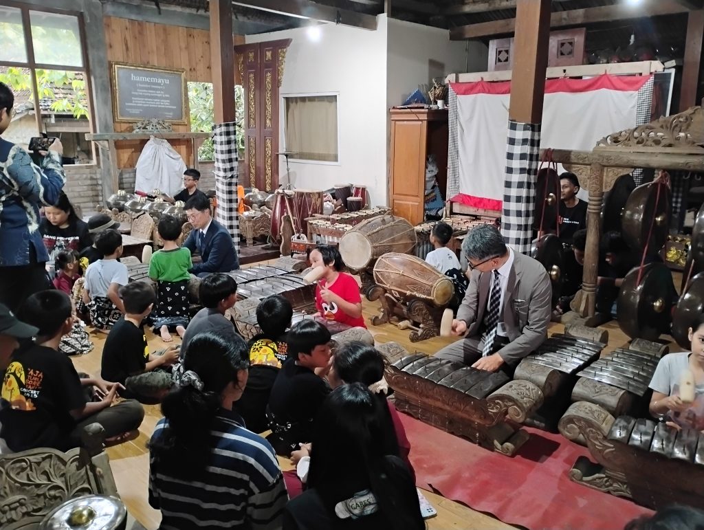 In closing, Prof. Shimo and Mr. Hisashi Sakai had the opportunity to participate directly in a practice session playing Gamelan. This interaction was carried out with the young members of the Omah Cangkem Sanggar, where they tried to play the Saron instrument. The moment, which was marked by enthusiastic guidance from the studio children, showed the ease of access and inclusive nature of Gamelan as a means of social interaction. The two delegates from Japan showed great enthusiasm in trying out the instrument, underscoring the potential of Gamelan as a means of cross-cultural communication.